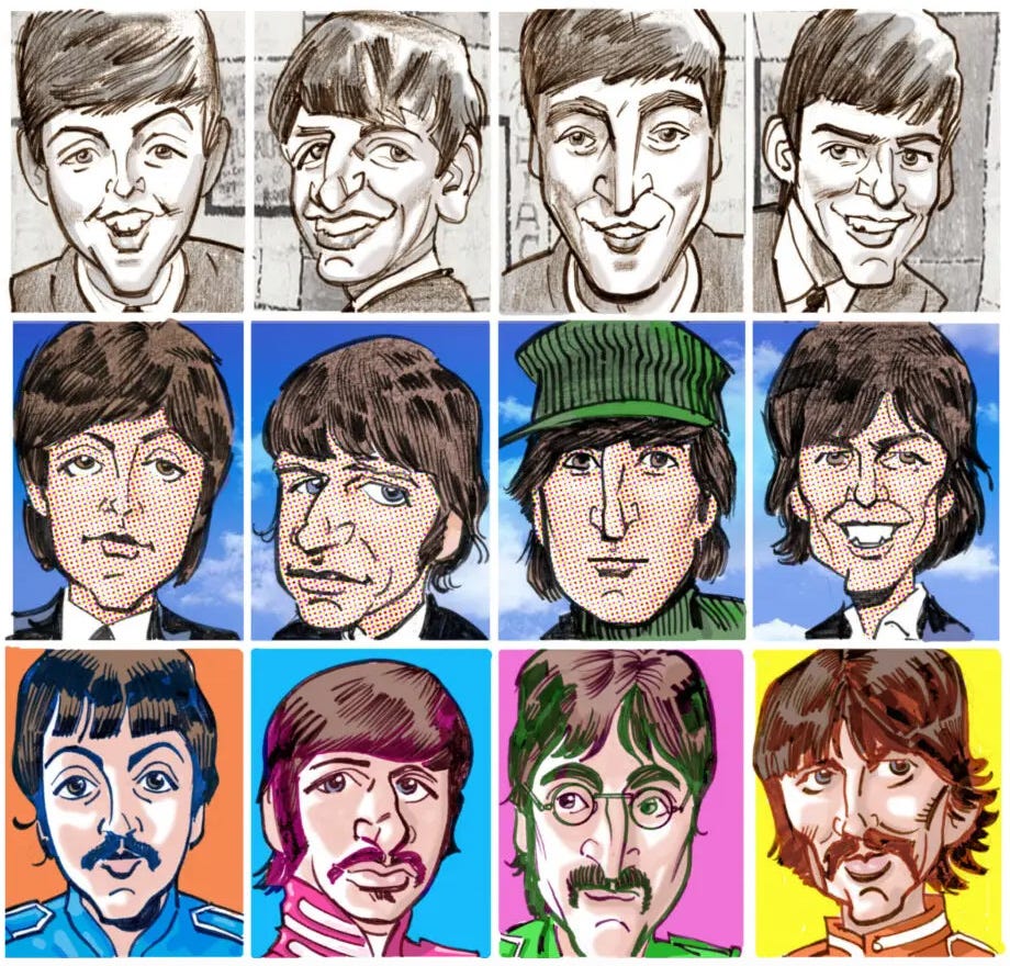 caricature (noun) - a depiction that exaggerates features or qualities, often to a ludicrous or comedic extent; a highly inferior reproduction [kar-i-kuh-cher]