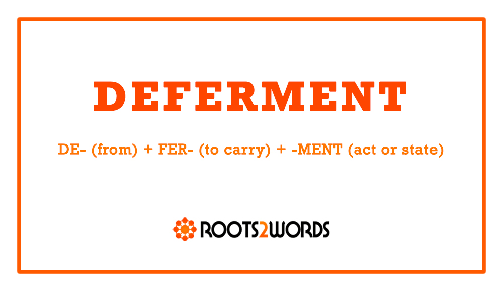 deferment (noun) - an official delay or postponement of a payment or obligation, often applied to enrollment, repayment, or military service; the act putting something off until later (also deferral) [dih-fur-muhnt]