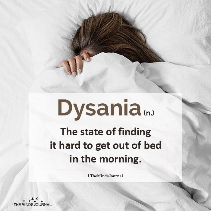 dysania (noun) - extreme, often persistent and debilitating difficulty in getting out of bed in the morning, often linked to an underlying condition like depression [dih-SAY-nee-uh]