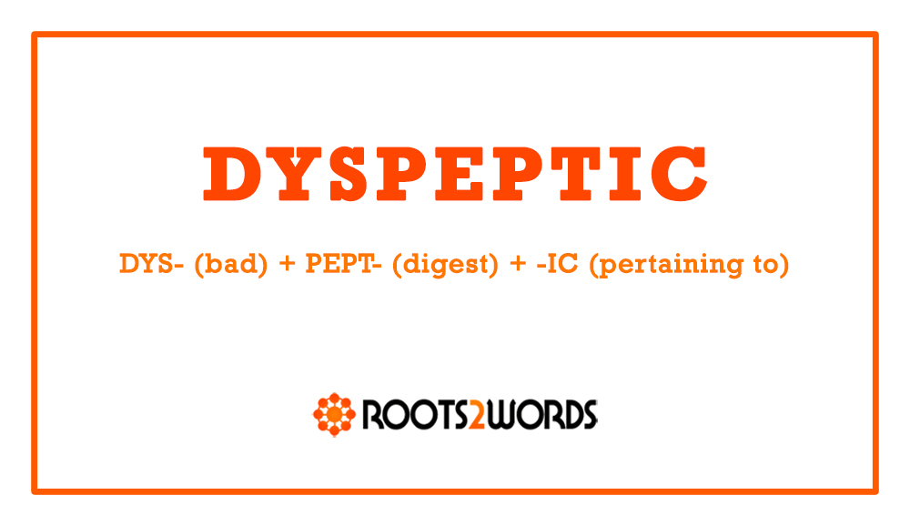 BREAKDOWN: DYS- (bad) + PEPT- (digest) + -IC (pertaining to)