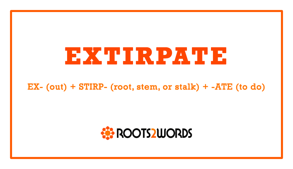 BREAKDOWN: EX- (out) + STIRP- (root, stem, or stalk) + -ATE (to make or do)