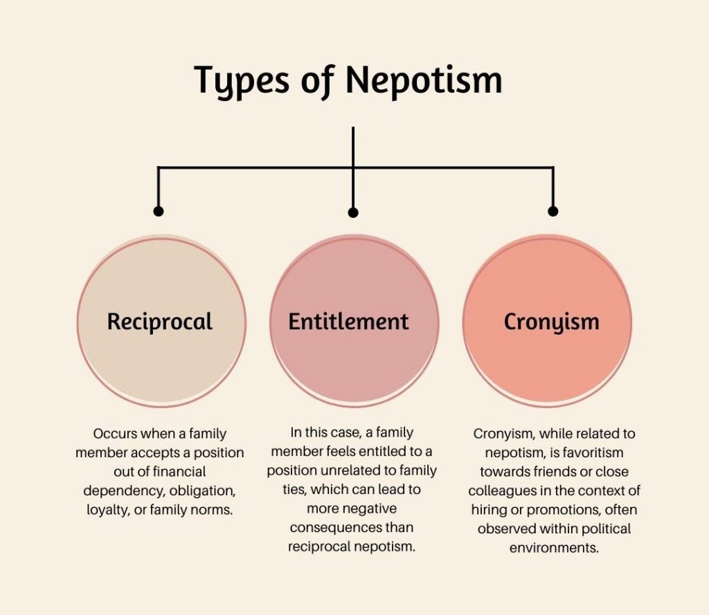 nepotism (noun) - the act or practice of someone with power or influence granting an advantage, privilege, or position to relatives, friends, or associates; patronage based on kinship [nep-uh-tiz-uhm]