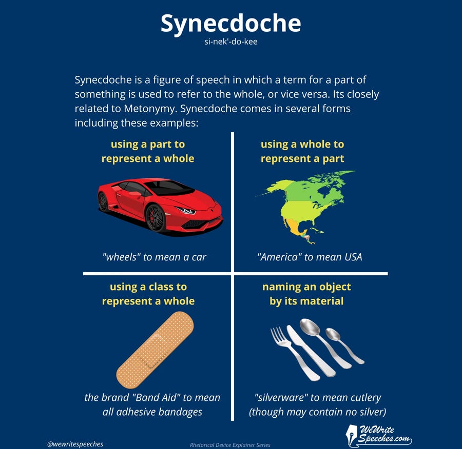 synecdoche (noun) - a literary device or figure of speech in which a part is made to represent the whole or vice versa [si-nek-duh-kee]